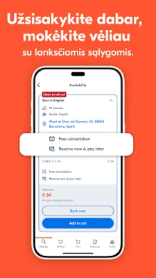 Su „GetYourGuide" lankstumas yra garantuotas. Planuokite keliones be streso, naudodamiesi galimybe rezervuoti dabar, o mokėti vėliau, užsitikrindami populiariausių pramogų vietas. Mėgaukitės momentiniu užsakymo patvirtinimu ir galimybe gauti bilietus akimirksniu, nesvarbu, ar planuojate iš anksto, ar pasinaudojate paskutinės minutės pasiūlymu. Be to, visi jūsų bilietai pasiekiami neprisijungus prie interneto – tiesiog atsisiųskite juos į savo mobilųjį įrenginį ir keliaukite ramia galva. Jūsų patogumui veikia 24/7 klientų aptarnavimas ir lanksčios atšaukimo sąlygos, leidžiančios pakeisti planus, jei iki kelionės liko daugiau nei 24 valandos.