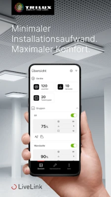 Nuo pat pirmo įjungimo, LiveLink šviesos valdymo sistema pasižymi visišku veikimu ir nepriekaištingu funkcionalumu. Jos išmanusis veikimo principas leidžia automatiškai atpažinti visus sistemos elementus, užtikrinant greitą ir efektyvų paleidimą. Judesio aptikimas ir nuolatinės šviesos reguliavimas, esminės jutiklių funkcijos, yra iš anksto sukonfigūruotos ir aktyvios, o prijungti mygtukai suteikia galimybę patogiai įjungti, išjungti ar pritemdyti apšvietimą. Be to, jei naudojami „Tunable White" šviestuvai, TRILUX HCL kreivė jau būna aktyvuota, automatiškai pritaikydama apšvietimą prie paros ritmo. Tai užtikrina, kad sistema yra paruošta darbui be sudėtingų nustatymų, garantuojant patikimą ir efektyvų apšvietimo valdymą.