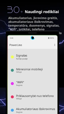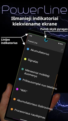„PowerLine" suteikia išmaniuosius indikatorius jūsų būsenos juostoje, rodančius gyvybiškai svarbią informaciją. Stebėkite baterijos įkrovą, tinklo stiprumą ar kitus duomenis bet kurioje ekrano vietoje, įskaitant užrakinimo ekraną, patogiai ir aiškiai.