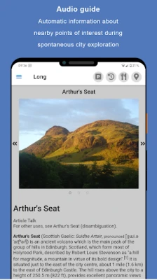 Pamirškite griežtus tvarkaraščius ir fiksuotus maršrutus! „Sightseeing App" atveria duris į nepakartojamą, asmeninę pažintį su Edinburgu. Atraskite šį nuostabų miestą savo tempu, naudodamiesi bet kokia transporto priemone ar tiesiog vaikštinėdami. Mūsų programėlė veikia kaip jūsų asmeninis gidas: vos priartėjus prie reikšmingos vietos, „Sightseeing App" subtiliai atkreips jūsų dėmesį tikslia kryptimi, atstumu, iškalbinga nuotrauka ir trumpu aprašymu, kuris bus perskaitytas balsu bei parodytas ekrane. Tai lyg turėti savo privatų ekskursijų autobusą kišenėje, leidžiantį atrasti kiekvieną kampelį be jokio skubėjimo.