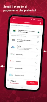 Patirkite neprilygstamą patogumą su „Trenitalia" greitojo pirkimo funkcija ir geografinės vietos nustatymu, leidžiančiu įsigyti bilietus akimirksniu. Mokėjimo būdų įvairovė užtikrina, kad visada rasite Jums tinkamiausią: nuo populiarių kreditinių kortelių, „PayPal", „Google Pay", „Satispay" ir „Amazon Pay" iki banko pavedimų. Taip pat galite panaudoti sukauptus „CartaFRECCIA"/„X-GO" taškus, bonusus, kreditus ar dovanų korteles, maksimaliai išnaudodami visas turimas privilegijas.